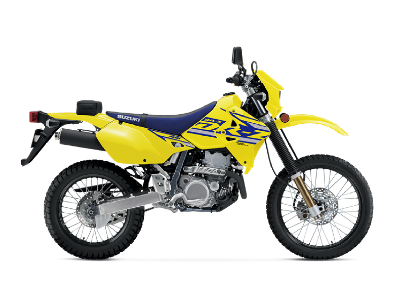 True to its Suzuki off-road heritage, the DR-Z400S is available with Champion Yellow body work that is augmented with new blue and silver graphics. Also new are gray and silver graphics on the Solid Black bodywork that makes the DR-Z stand out on the road, on the trail, or even when parked.