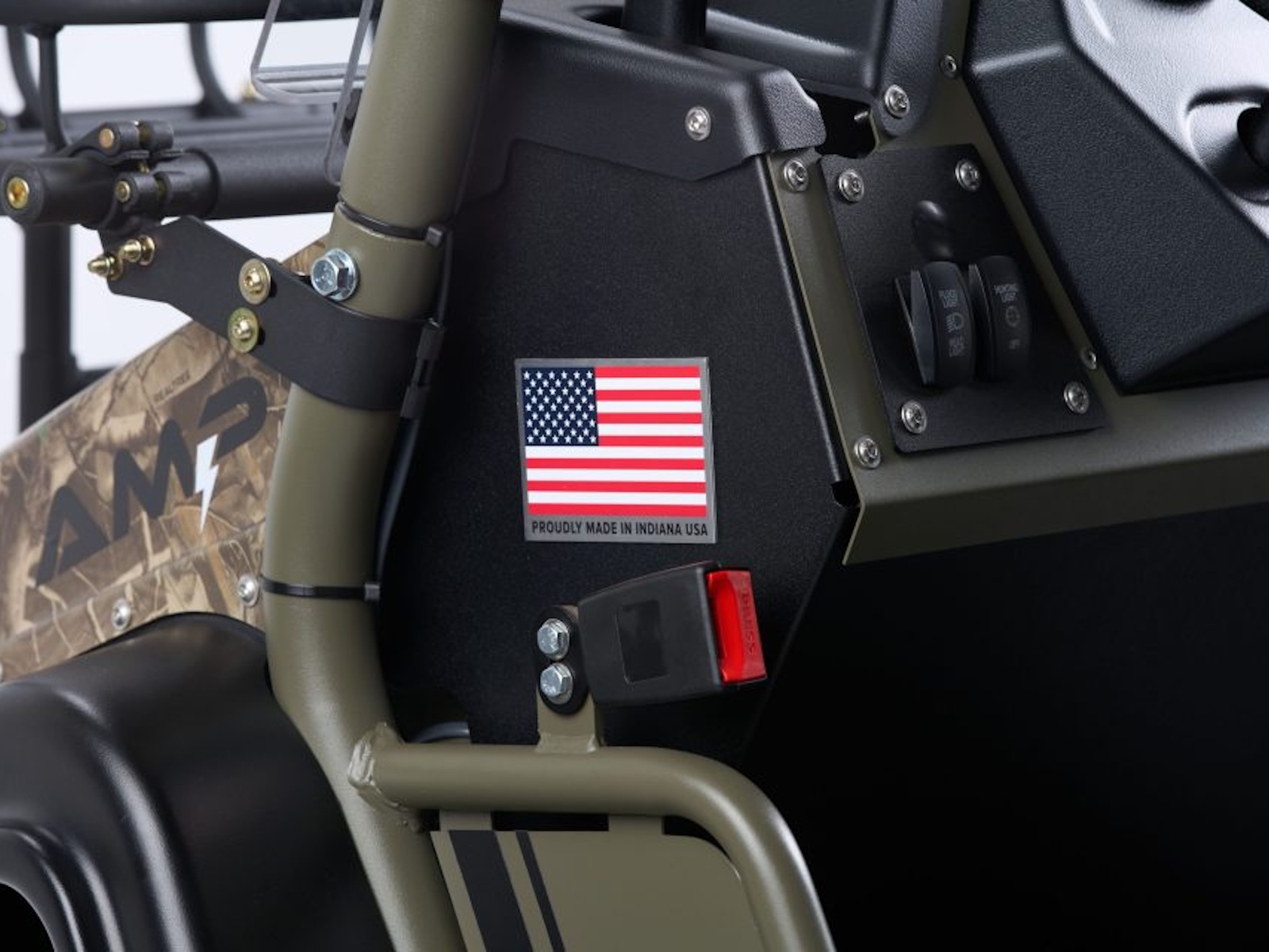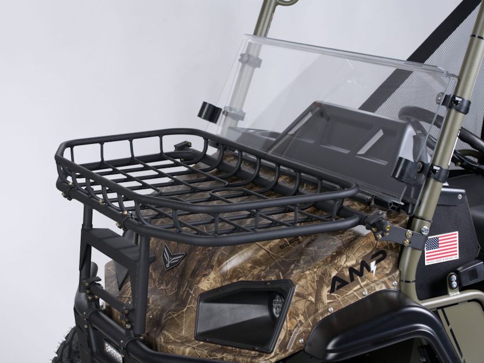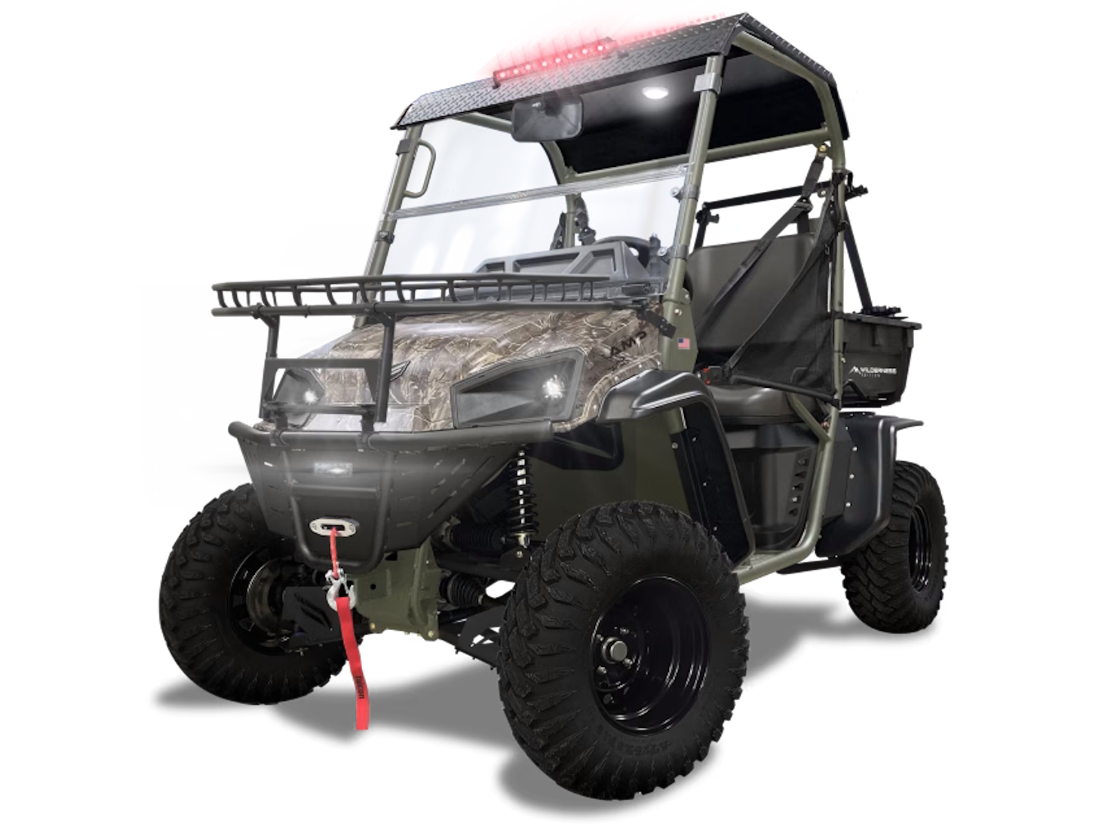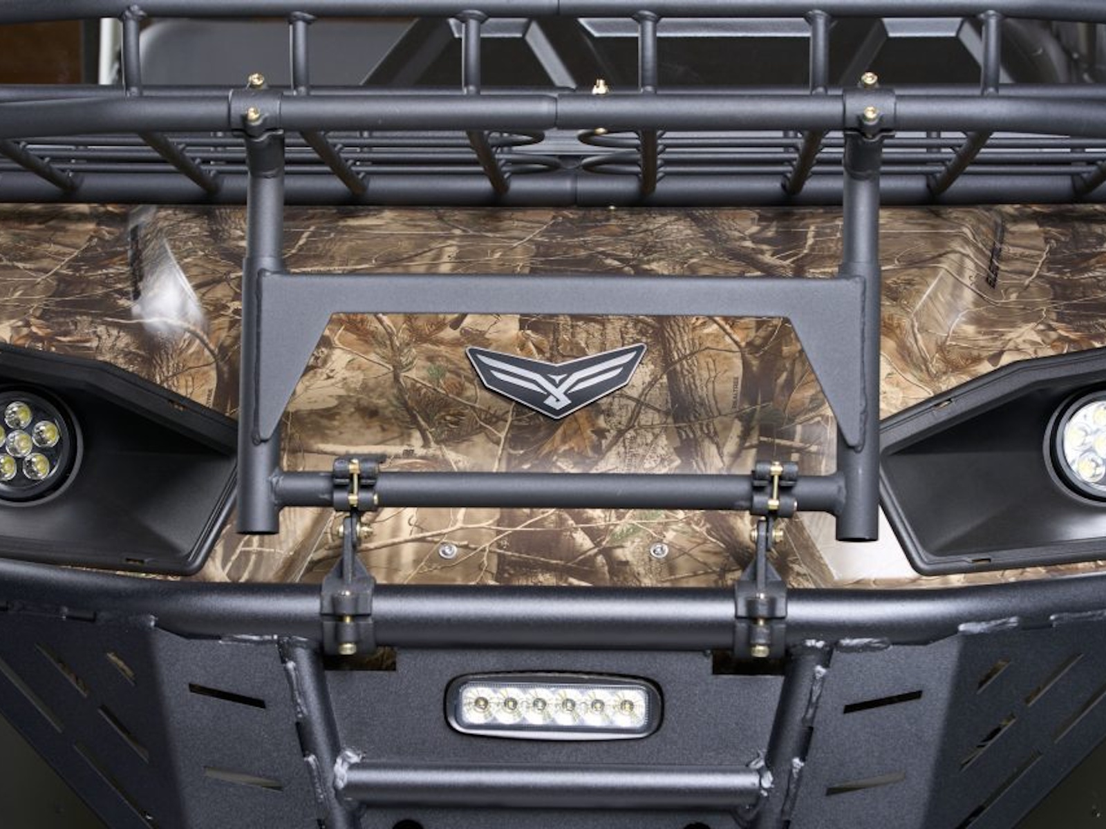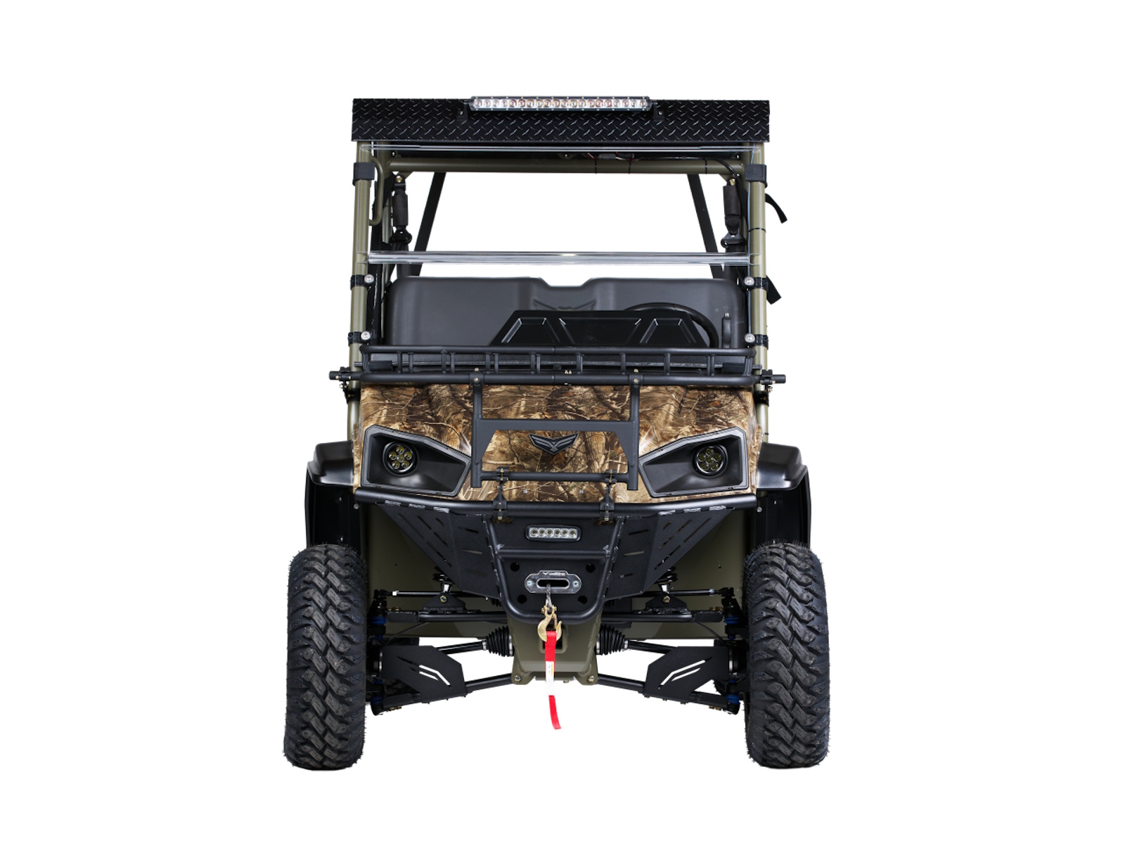 Content Included: HD Bumper with LED Light, Custom Color: Forest Green, Real Tree Camo Hood, Winch, Split Windshield, CV Guards, Metal Roof, EPS Power Steering, Armory Rack, Dome Light, 20" Red LED Hunt Light, Rear Work Light, USB Charger, Center Console with Lockable Storage, Rearview Mirror, Front Hood Rack