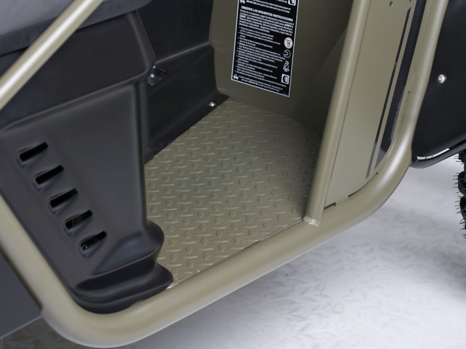 3-point lap belts, roll-over-protection certified, tail/brake lights, horn, 360º of reflective decals, and side safety nets.