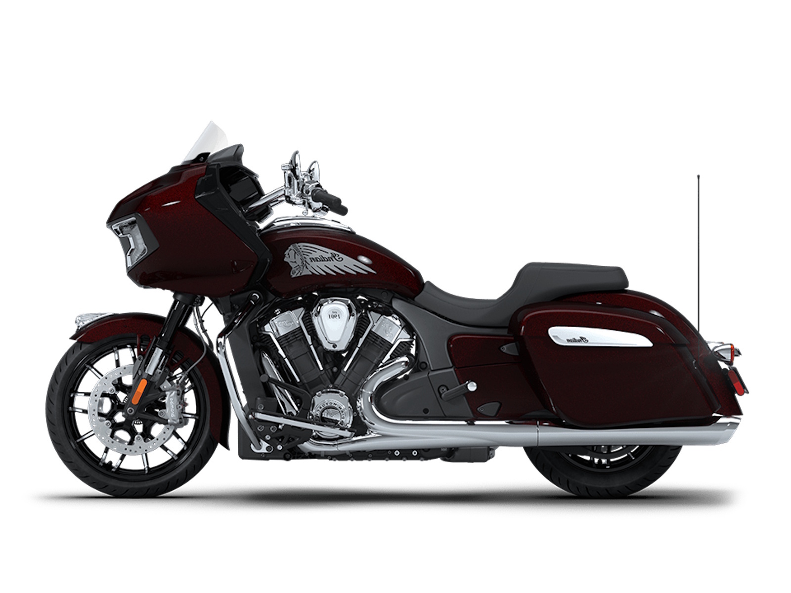 Find specifications below for the 2026 Indian Challenger Limited motorcycle. Specs include displacement, engine type, torque, fuel capacity, seat height, wheelbase, height, weight, length, brakes, suspension, gauges, color options and standard equipment.