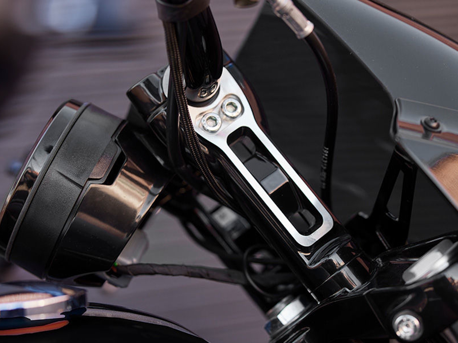 - Stylish gloss black 6-inch Moto Style Risers with machine highlights come standard and mean business. Machined Triples and Moto Handlebars complete the package, both in custom looks and dialed ergonomics that fit its menacing style with improved reach and control for aggressive riding.