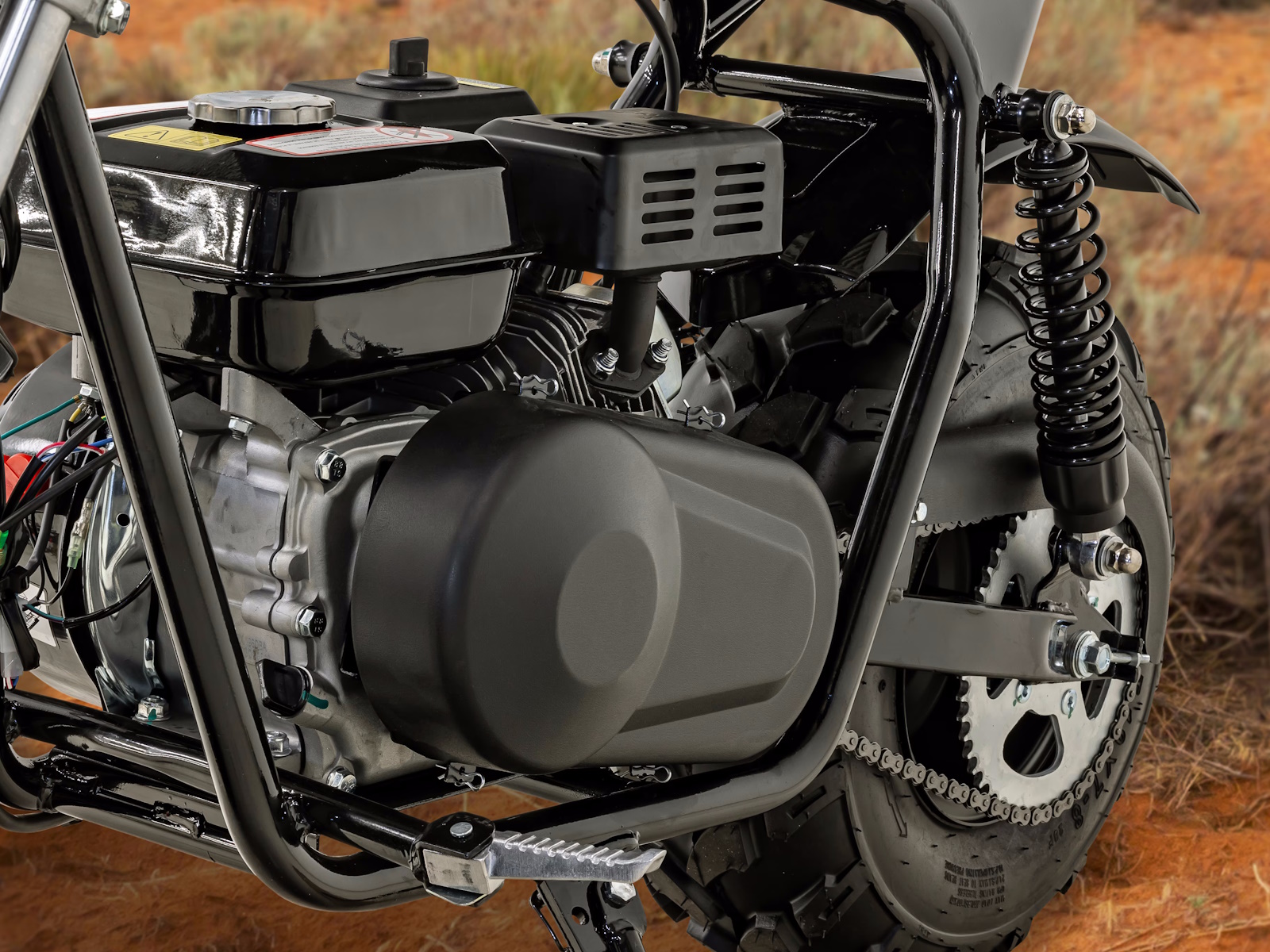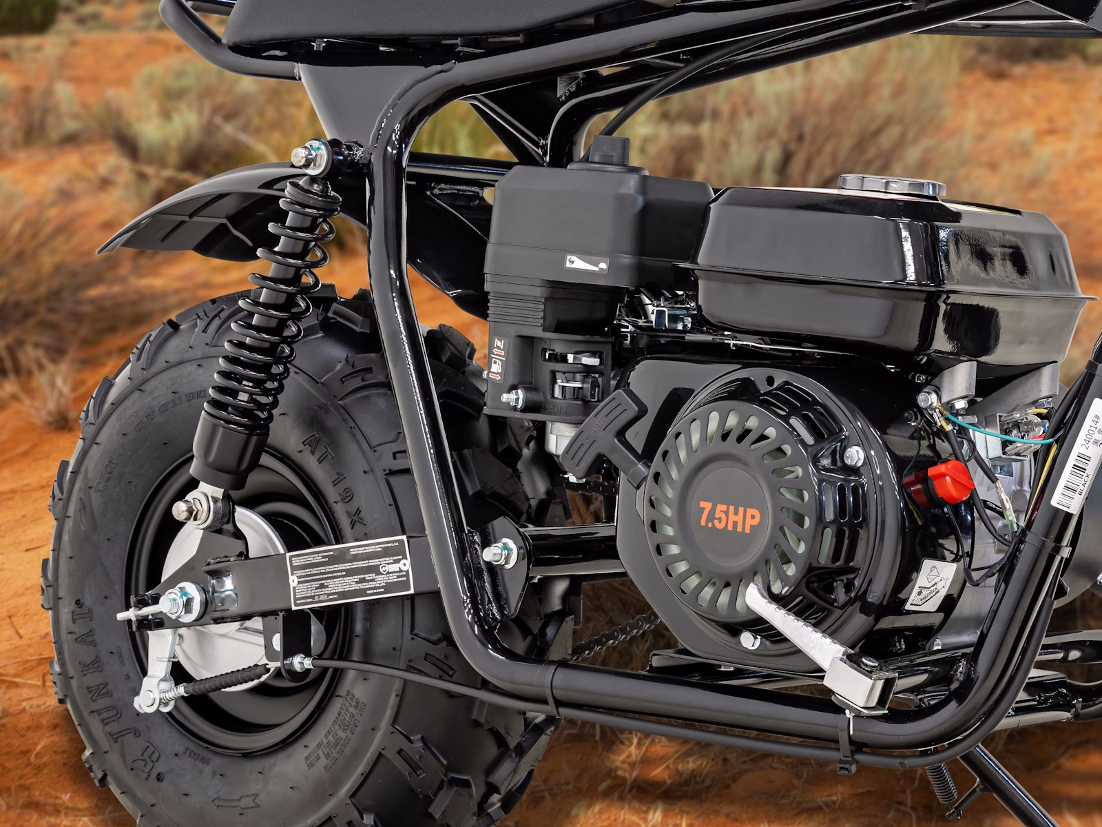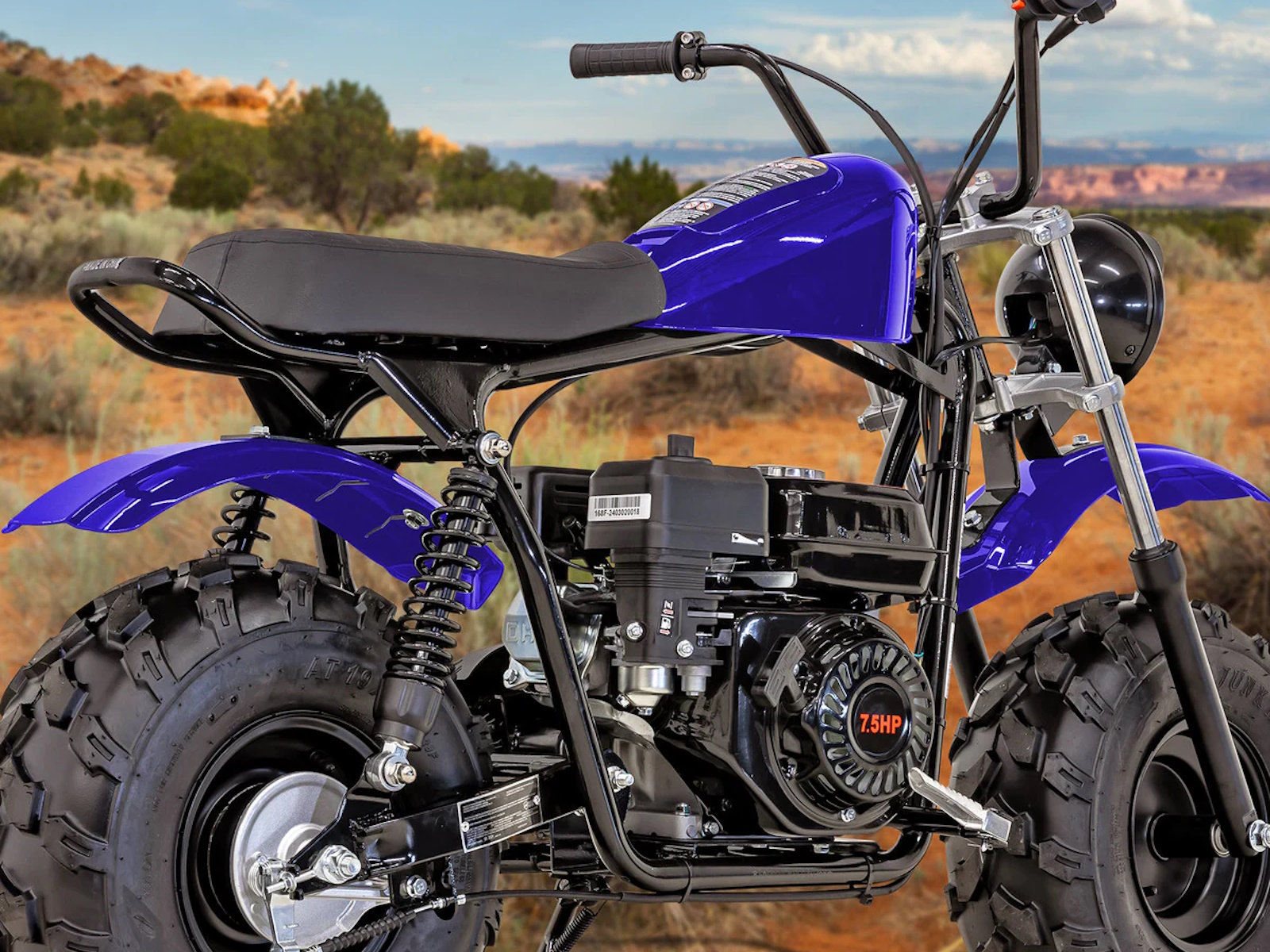 Get ready for off-road fun with the Massimo 200S Mini Bike, a modern classic built for adventure. It’s powered by a rugged and reliable 196cc, 7.5 HP engine and features a smooth dual-shock rear suspension for a comfortable ride on tough trails. This mini bike boasts super-wide 19-inch all-terrain tires that provide excellent grip and stability on dirt, grass, and pavement. With its low seat height, easy pull-start, and a faux gas tank for convenient storage, the 200S is the perfect choice for riders seeking a simple, durable, and thrilling off-road experience.