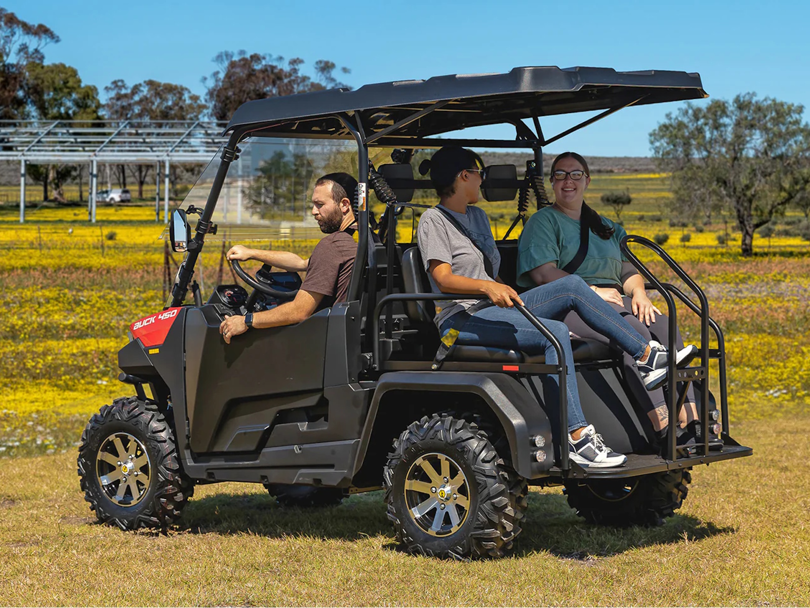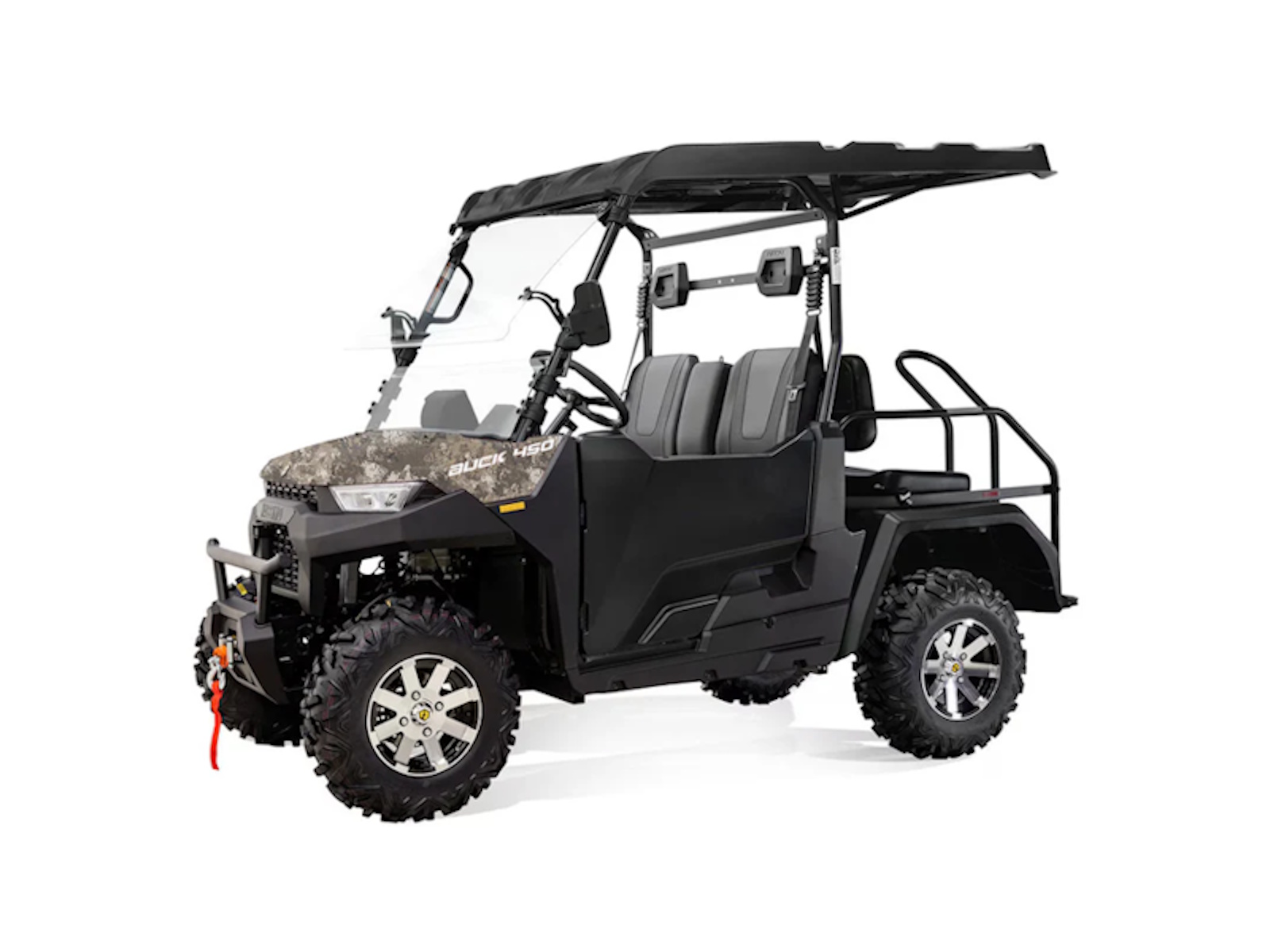 The Massimo Buck 450X Golf is the perfect crossover UTV for the course, property, and trail. It features a reliable 25 HP, 352cc EFI engine and On-Demand 4WD to confidently tackle any terrain. This "X" model is loaded with premium features, including a 7-inch touchscreen with a rearview camera, a full tilting windshield, hard top roof, and ABS half doors for all-weather comfort. With versatile rear-facing passenger seats that convert to a cargo bed and a standard 3000lb winch, the Buck 450X Golf delivers an unmatched combination of technology, utility, and value.