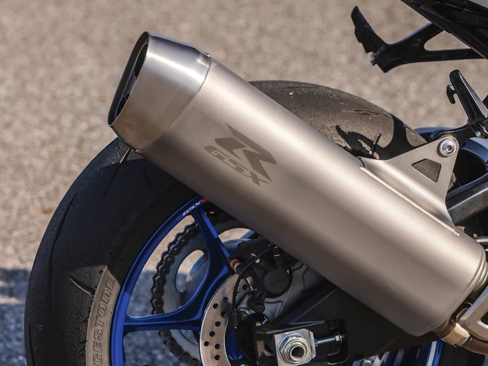 - The media-blasted titanium muffler with muted GSX-R logo enhances the new exhaust system’s appearance and is mounted high for good ground clearance at high lean angles while creating an exciting, distinctive sound. The exhaust’s new layout helps reduce the muffler size from 8.3 L to 5.5 L but retains the same performance as the prior system.