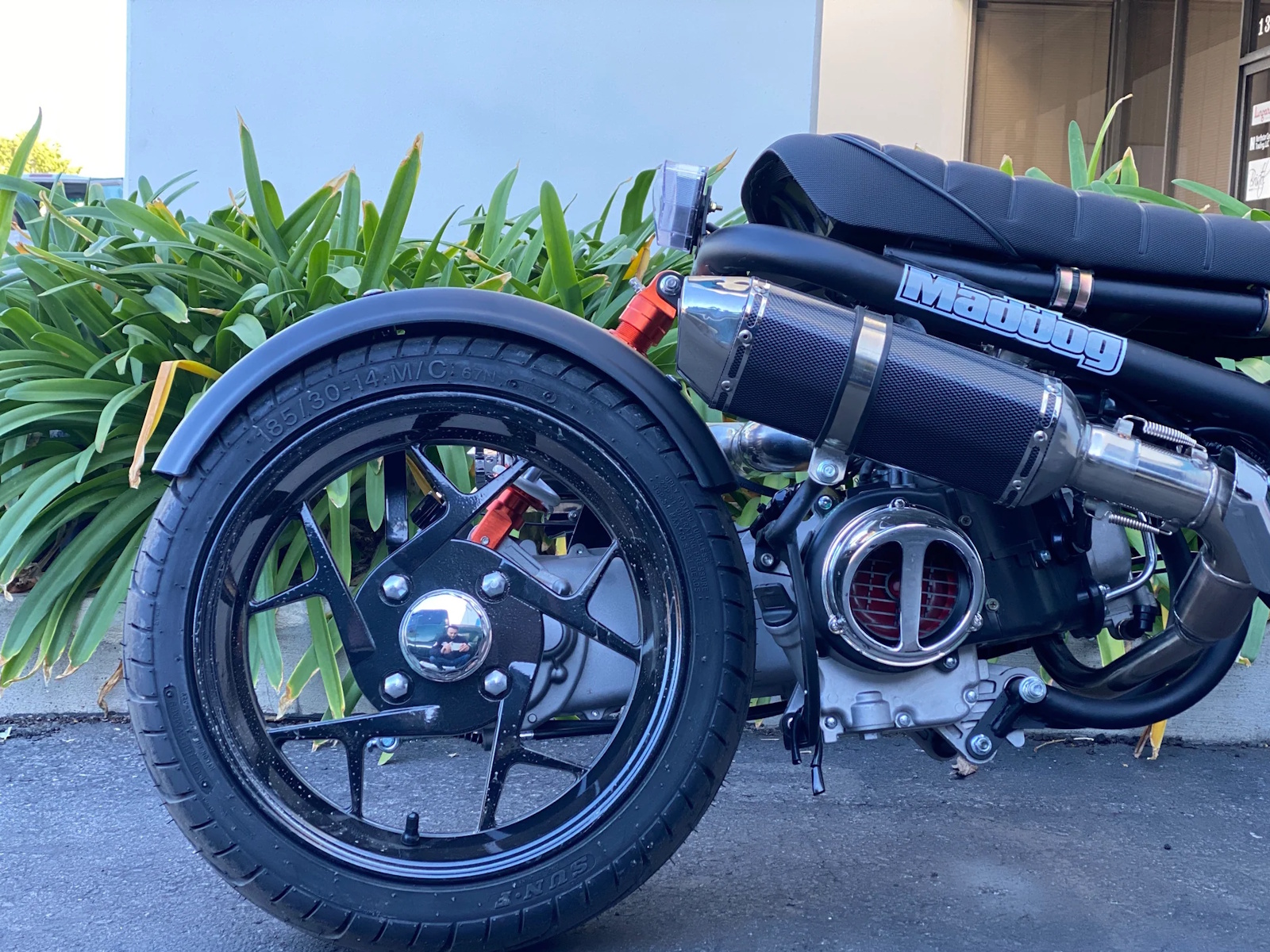 The maddog gen 5 comes with large blacked-out rear wheels. Its large size contribuites to a smoother, more confident riding experience.